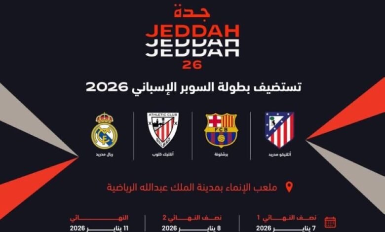 تقرر أن يستضيف ملعب الإنماء بمدينة الملك عبدالله الرياضية في جدة منافسات كأس السوبر الإسباني 2026 في الفترة من 7 إلى 11 يناير القادم بمشاركة أندية: برشلونة، ريال مدريد، أتلتيكو مدريد، أتلتيك بيلباو.