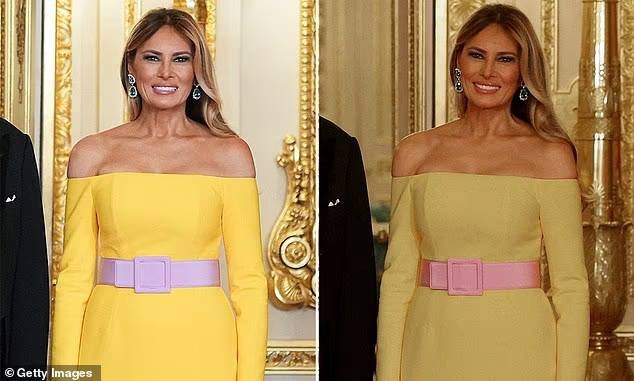 أثارت الصور التي التقطت لملانيا بجانب زوجها الرئيس دونالد ترمب، وملك بريطانيا تشارلز والملكة كاميلا، تساؤلات حول لون الفستان، إذ بدا في بعض الصور أصفر فاقعًا وفي أخرى أكثر نعومة مثل لون الزبدة.
